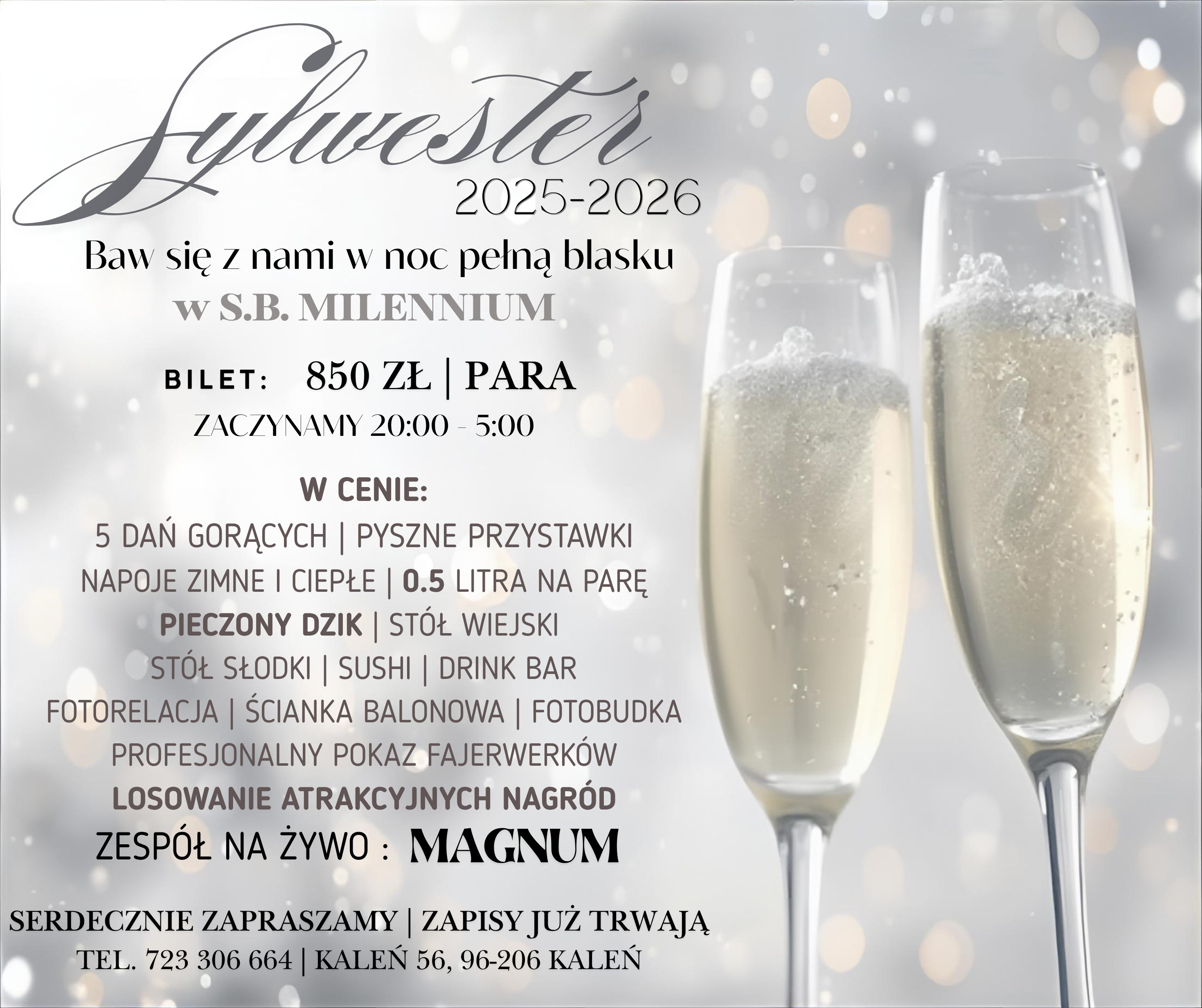 Serdecznie zapraszamy do wspólnego świętowania Sylwestra w S.B. MILENNIUM! Przygotowaliśmy dla Państwa niezapomnianą noc pełną atrakcji i smakowitych doznań. Oto, co dla Was przygotowaliśmy: